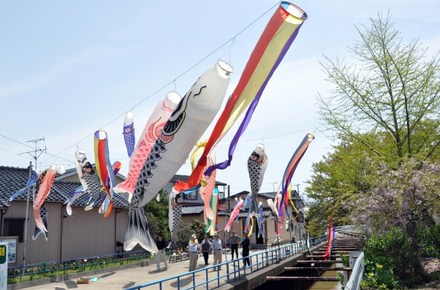 薫風に乗って泳ぐこいのぼり。よしやぶ川の上には約40匹が飾られた=市内松美町 (2012/05/01)