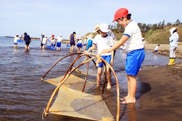 手作りの四つ手網でイサザ捕りをする鯨波小児童=1日、鯨波海岸 (2012/05/02)