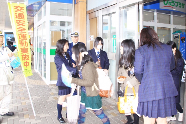 仲間の高校生に、自転車の安全利用を呼び掛ける高校生セーフティーリーダー=12日午前、JR柏崎駅 (2012/04/12)