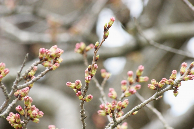 つぼみが膨らみ、先端がピンク色になり始めたソメイヨシノ=13日午前、赤坂山公園 (2012/04/13)