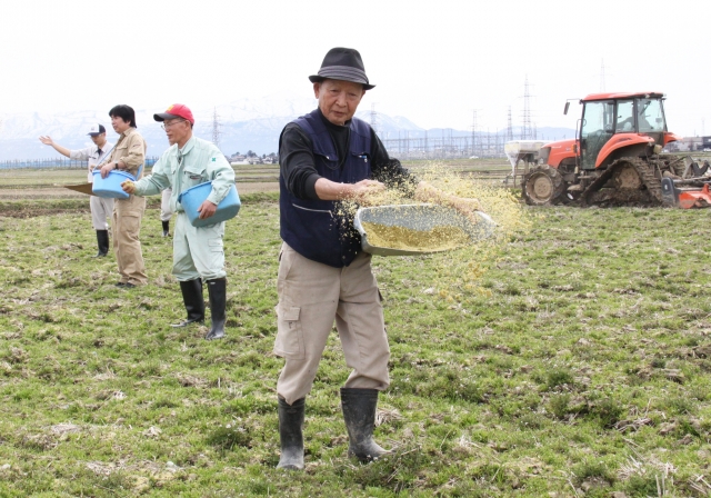 残雪の米山を背に、コメ作りに向けて竹パウダーをまく参加者=16日、市内土合新田 (2012/04/18)