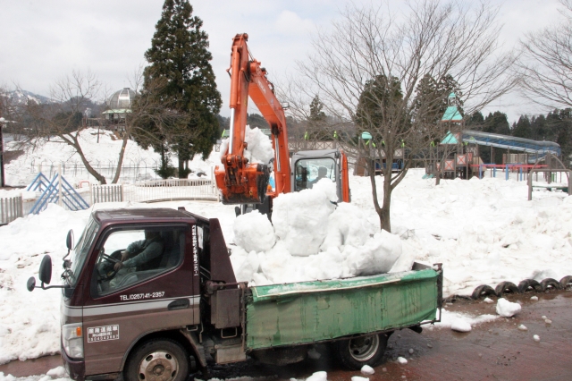 GWを間近に、除排雪作業を行うこども自然王国=18日、市内高柳町地内 (2012/04/19)