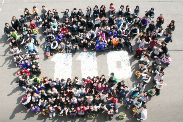 エコ活動で集めたキャップで創立記念の「110」の数字を形取った北鯖石小 (2012/03/21)