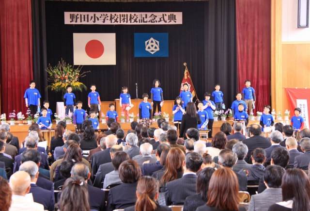 閉校記念式典で会場の参加者に呼び掛ける野田小児童 (2012/03/24)