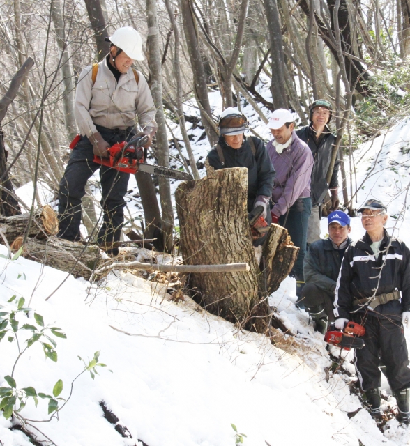 カタクリの開花を前に登山道整備に取り組む保存会メンバー=市内西山町別山の高内山 (2012/03/29)