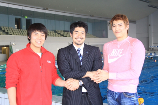 ブルボンKZの青柳監督(中央)と握手する鄭洲和選手(左)と宋元鎬選手 (2012/03/30)