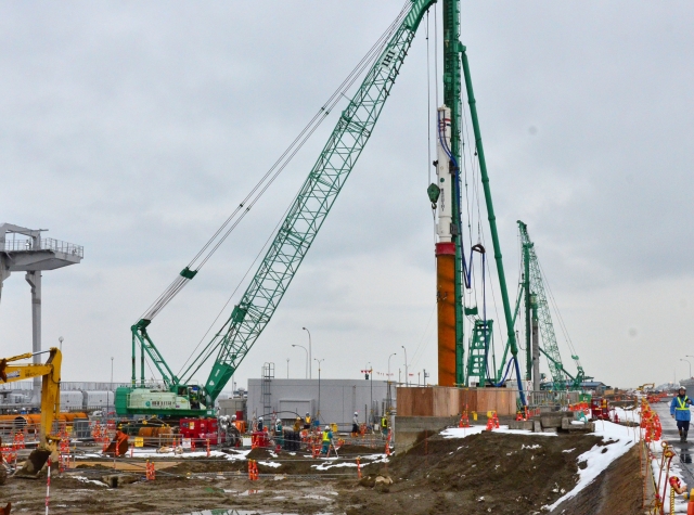 柏崎刈羽原発の防潮堤建設工事の基礎くい打設=14日、1〜4号機側 (2012/02/15)