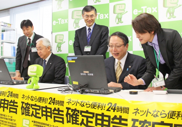 電子申告システムで入力する会田市長(右)と品田村長=柏崎税務署 (2012/02/16)