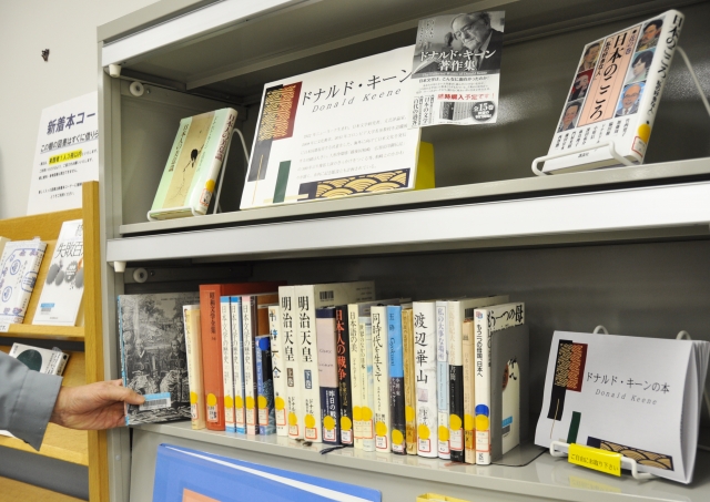 市内に記念館が建設されるドナルド・キーンさんの著作などを集めた特設コーナー=ソフィアセンター (2012/02/17)