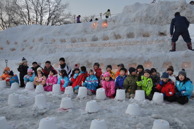 ミニかまくらにろうそくの火がともり、大喜びの子どもたち=19日、市内中鯖石コミセン駐車場 (2012/02/21)