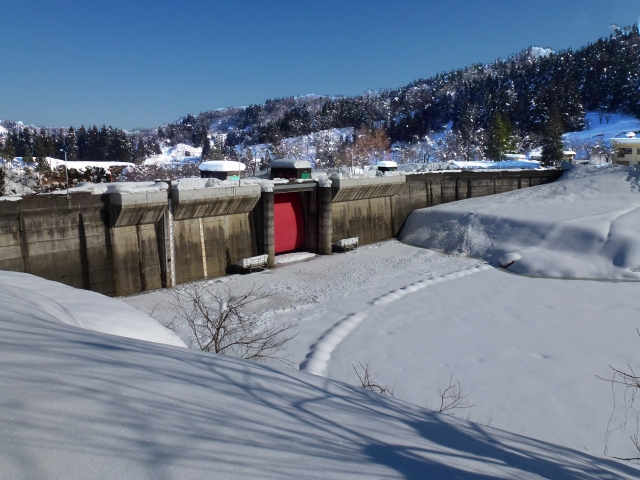土砂堆積抑制を目指し、3月から通砂が行われる鯖石川ダム (2012/02/22)