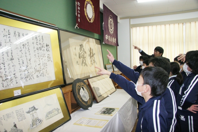 旧別山小の校章などを興味深く見る内郷小の児童 (2012/02/23)
