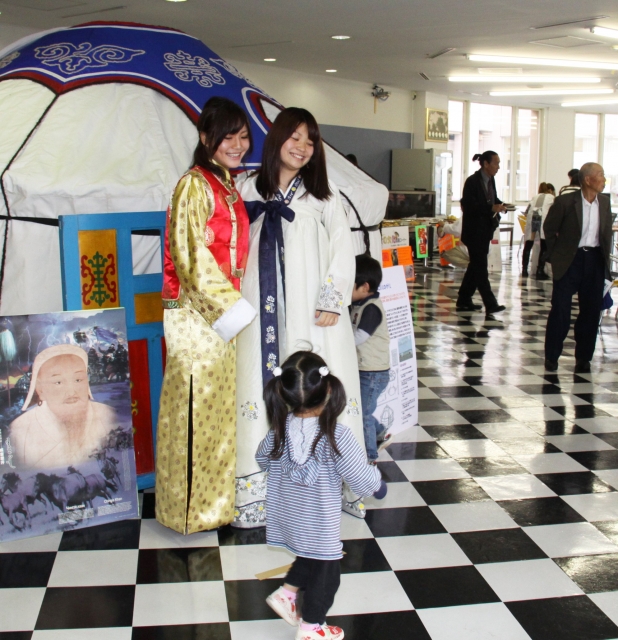 産大紅葉祭。カフェテリア内にモンゴルの伝統家屋を建て、来場者が民族衣装で記念写真 (2011/11/07)