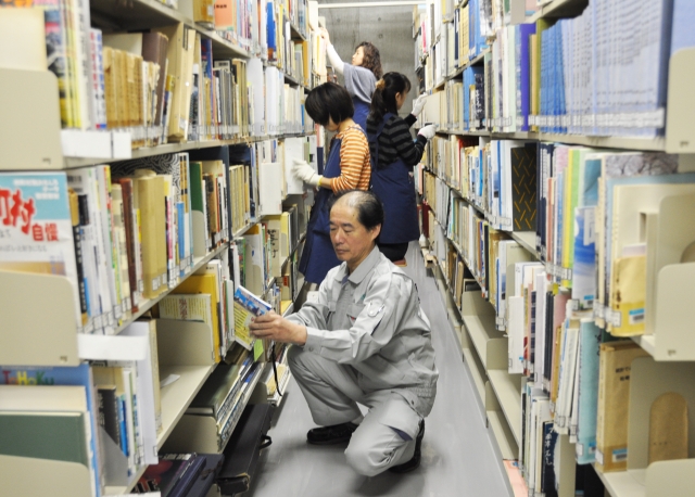 特別整理休館中のソフィアセンター。端末機器を使って蔵書を点検する職員たち (2011/11/09)