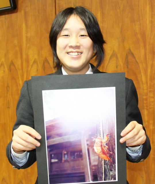 高校生の全国総合文化祭に推薦されたカラー作品「記憶」と大橋さん (2011/11/10)