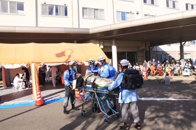 消防演習の救護テントで救急隊とともにトリアージを行う看護師=10日、新潟病院 (2011/11/11)