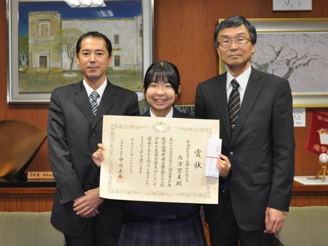 「わたしの主張全国大会」で文科大臣賞に選ばれた一中3年の西沢さん(中央)=14日、同校校長室 (2011/11/15)