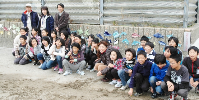 防砂用フェンスに「海の生物」の陶板レリーフを張り付けた児童ら=東の輪海浜公園 (2011/10/28)