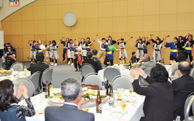 「ロングラン」の設立を祝う会。よさこいの元気な演舞で喜びに包まれた=3日、市民プラザ (2011/11/04)
