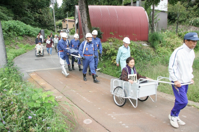 市防災訓練で、リヤカーや担架を使い、避難指示の出された要援護者を搬送=市内高柳町 (2011/10/03)