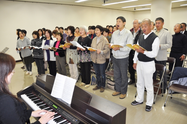 「東日本」復興へ思いを込め、練習を開始した市民コンサートの合唱団=5日夜、産文会館 (2011/10/07)