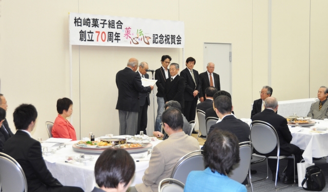 柏崎菓子組合の創立70周年記念の祝賀会で行われた感謝状の贈呈=8日夜、市民プラザ (2011/10/12)