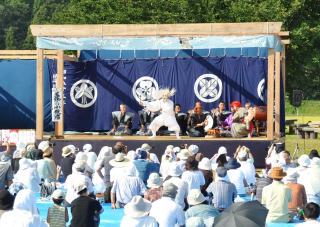 綾子舞現地公開で演じられた狂言「三条の小鍛冶」=11日、市内女谷、綾子舞会館前の芝生広場 (2011/09/12)