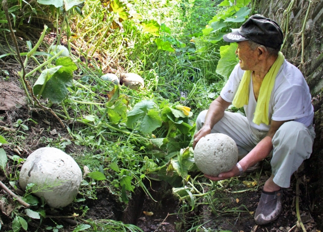 2個目のオニフスベを手に海沢さん。左手前は自宅敷地内に生える3個目 (2011/09/13)