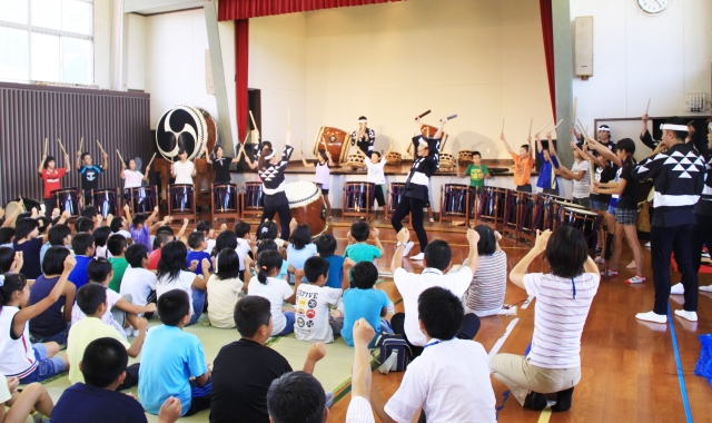 鼓童の学校公演で太鼓体験をした児童=南鯖石コミセン (2011/09/14)