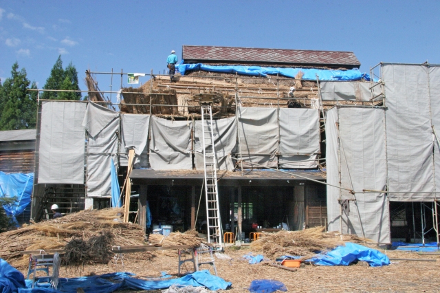 門出かやぶきの里で屋根のふき替え修繕が進められている「いいもち」 (2011/09/17)