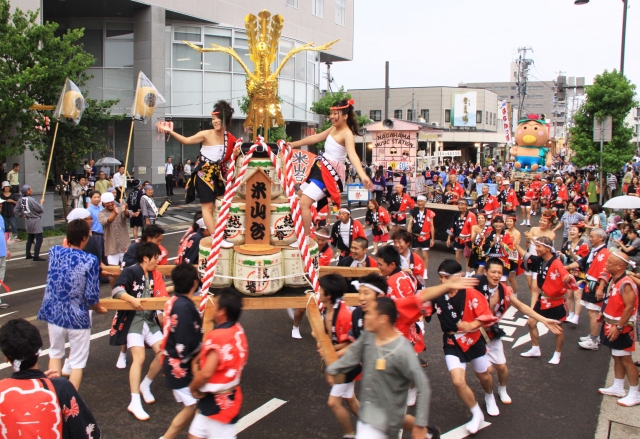 市民の心意気をアピールした「たる仁和賀」。市民プラザの本部前で威勢のよいもみ合いを繰り広げる参加団体=25日夜 (2011/07/26)