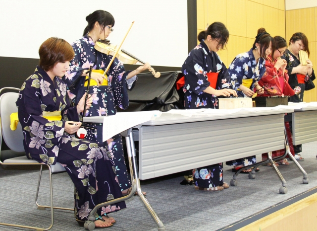 胡弓(こきゅう)、木琴、バイオリンなど自作楽器を演奏する工科大生=26日、市民プラザ (2011/07/27)