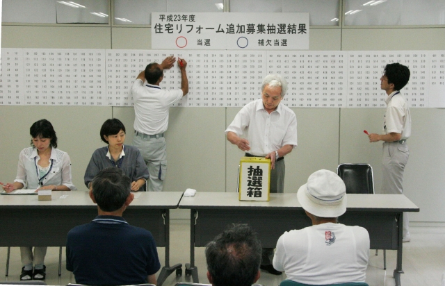 市民が見守る中で行われた市住宅リフォーム事業補助制度追加募集の抽選会=29日、市役所第2分館 (2011/07/29)