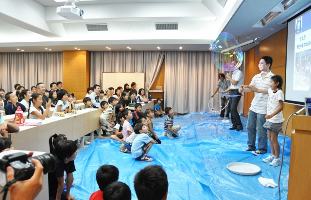 シャボン玉の実験などに大喜びのこども大学の参加者=新潟工科大 (2011/08/02)