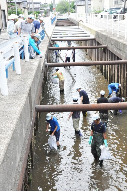 地域、企業から230人が参加し、よしやぶ川の水質浄化を目指した「川さらい」=7月31日、市内松美町地内 (2011/08/03)