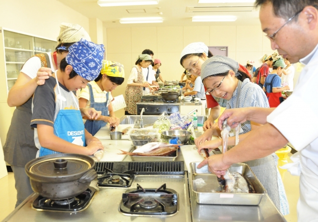 エプロン掛けの親子が参加したおさかな料理教室=中央地区コミュニティセンター (2011/08/04)