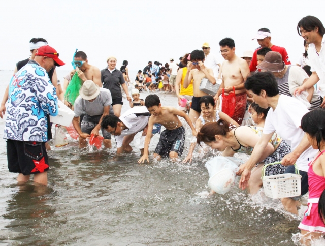 石地海岸で海開きに併せて行われたアサリまき。家族連れらでにぎわった=3日 (2011/07/04)