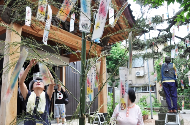 閻魔堂が中越沖地震の被害からすべて修復後初めての七夕飾り。東日本大震災への復興の願いも込められた=3日 (2011/07/05)