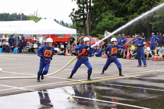 今年から「水出し」となった小型ポンプ操法競技。優勝した市消防団15分団=3日、佐藤池運動公園駐車場 (2011/07/06)
