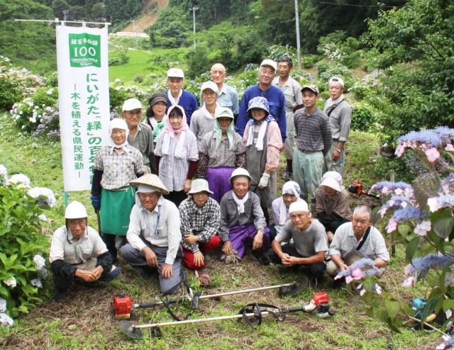 アジサイが広がる斜面で手入れに精を出した住民=市内西山町荒谷 (2011/07/07)