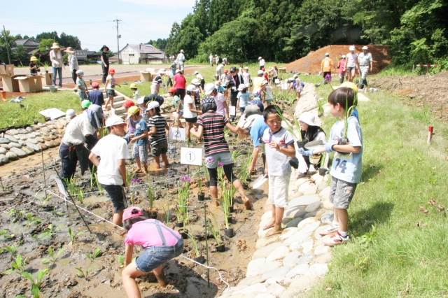 ビオトープの水路にカキツバタなどを植える中通小の児童ら=8日、旧中通中跡 (2011/07/11)