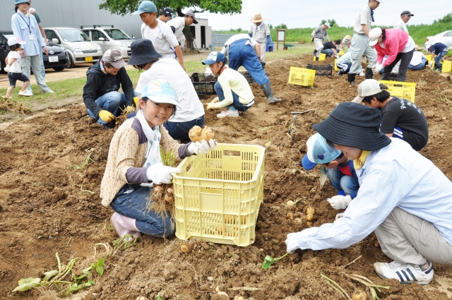 市内橋場の「みんなの農場」で行ったジャガイモ掘り。約80人が大きなイモを見つけるたびに歓声を上げた=10日 (2011/07/13)