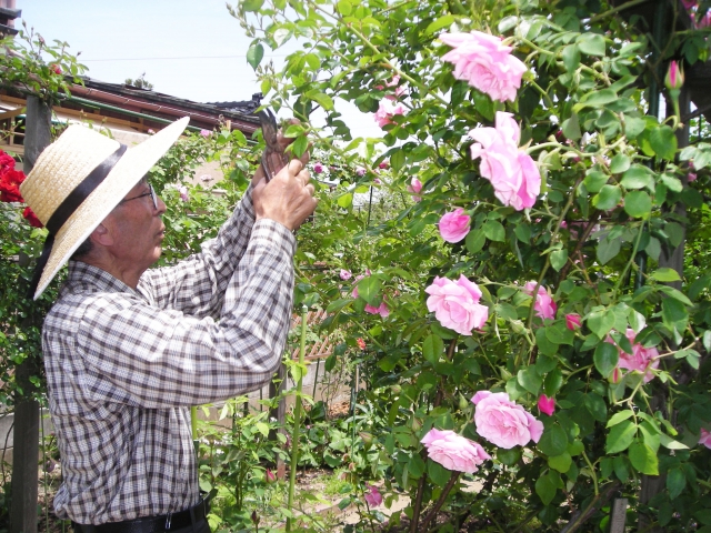 見頃を迎えたバラの花を手入れする石塚さん=市内茨目2 (2011/05/31)
