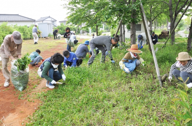 全市一斉クリーンデー。鵜川町町内会は子どもからお年寄りまで60人が草取りなどに精を出した=5日朝 (2011/06/06)