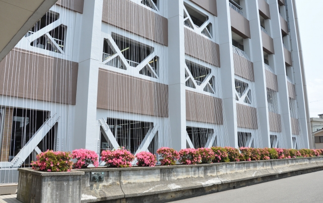 3階までひもが張られた市役所本庁舎の緑のカーテン。節電対策として、これまでより一段とスケールアップした (2011/06/07)