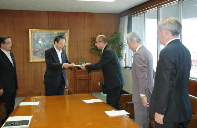 会田市長に、市の第4次総合計画後期計画への提言書を手渡す西川柏崎商議所会頭ら役員=18日、市長応接室 (2011/05/18)