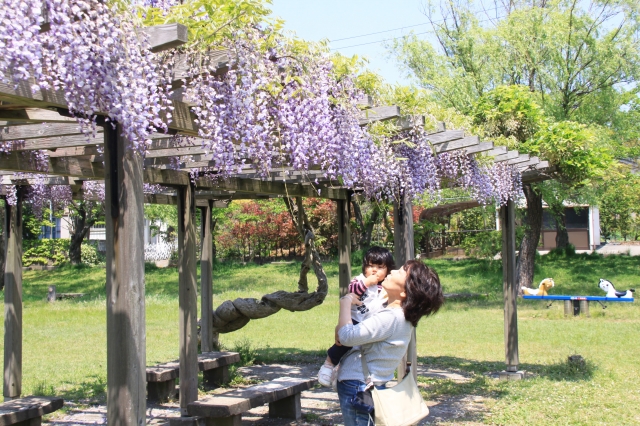見ごろを迎えた白竜公園の藤棚。淡い紫色の花房が垂れ下がり、甘い香りを漂わせている=18日 (2011/05/19)