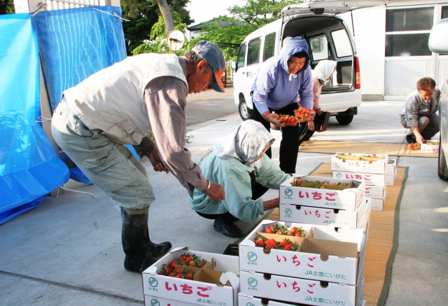 路地イチゴを持ち寄り、出荷する下大新田の人たち=20日朝 (2011/05/20)