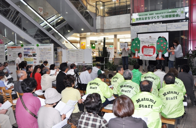 「元気なまちづくり事業」の公開審査会で発表を行う団体=21日、フォンジェ地下 (2011/05/23)