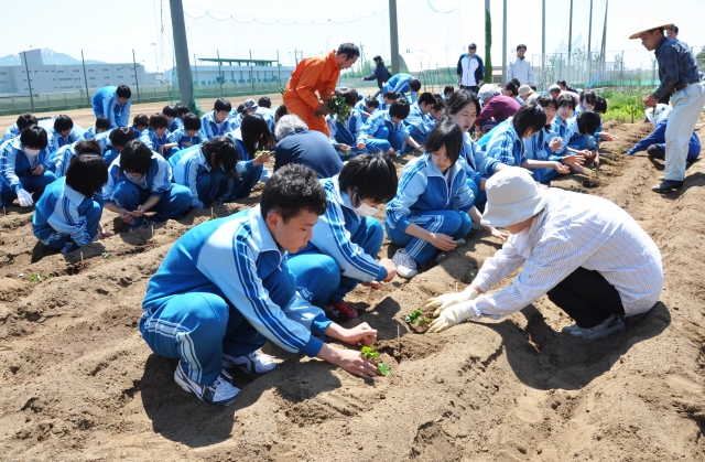 地域との「芋づる大作戦」で芋苗を植える一中3年生=24日、一中学校菜園 (2011/05/26)